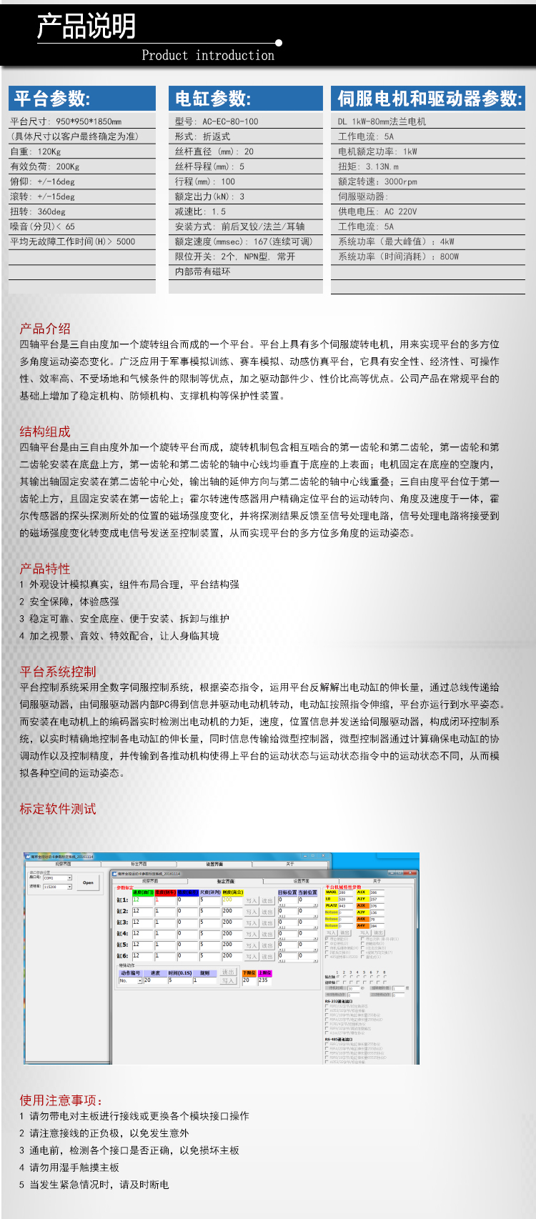 四軸平臺是三自由度加一個旋轉(zhuǎn)組合而成的一個平臺。平臺上具有多個伺服旋轉(zhuǎn)電機,用來實現(xiàn)平臺的多方位多角度運動姿態(tài)變化。廣泛應(yīng)用于軍事模擬訓(xùn)練、賽車模擬、動感仿真平臺,它具有安全性、經(jīng)濟(jì)性、可操作性、效率高、不受場地和氣候條件的限制等優(yōu)點,加之驅(qū)動部件少、性價比高等優(yōu)點。公司產(chǎn)品在常規(guī)平臺的基礎(chǔ)上增加了穩(wěn)定機構(gòu)、防傾機構(gòu)、支撐機構(gòu)等保護(hù)性裝置。
