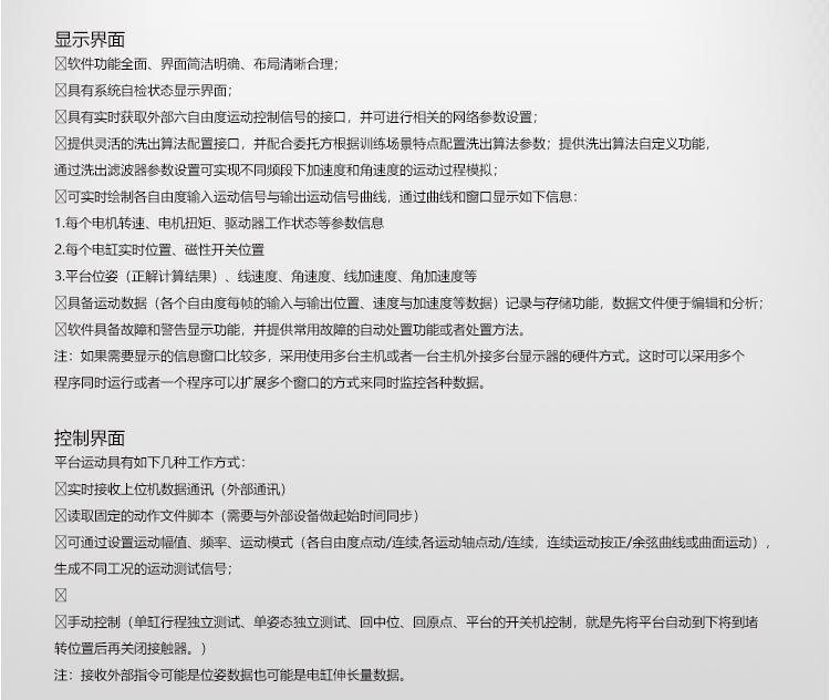 六自由度運動平臺涉及到機(jī)械、電氣、控制、計算機(jī)、傳感器,空間運動數(shù)學(xué)模型、實時信號傳輸處理等一系列高科技領(lǐng)域,因此六自由度運動平臺是控制領(lǐng)域水平的標(biāo)志性象征。主要包括平臺的空間運動機(jī)構(gòu)、空間運動模型、電動系統(tǒng)、控制系統(tǒng)。