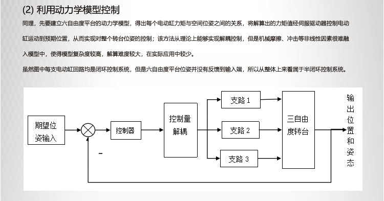 同理,先要建立六自由度平臺的動力學模型,得出每個電動缸力矩與空間位姿之間的關系,將解算出的力矩值經(jīng)伺服驅動器控制電動缸運動到預期位置,從而實現(xiàn)對整個轉臺位姿的控制;該方法從理論上能夠實現(xiàn)解耦控制,但是機械摩擦、沖擊等非線性因素很難融入模型中,使得模型復雜度較高,解算難度較大,在實際應用中較少。