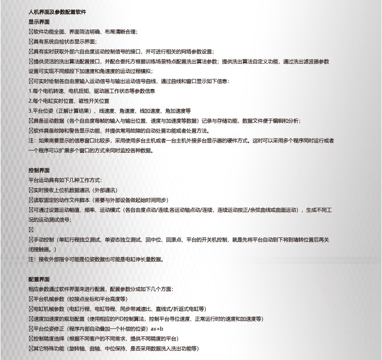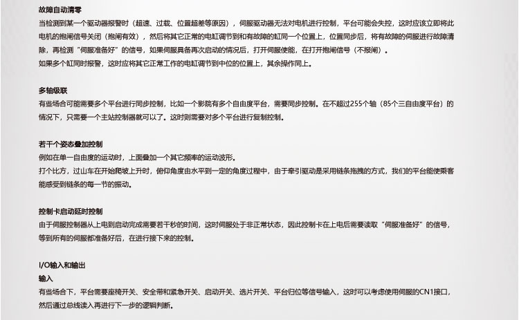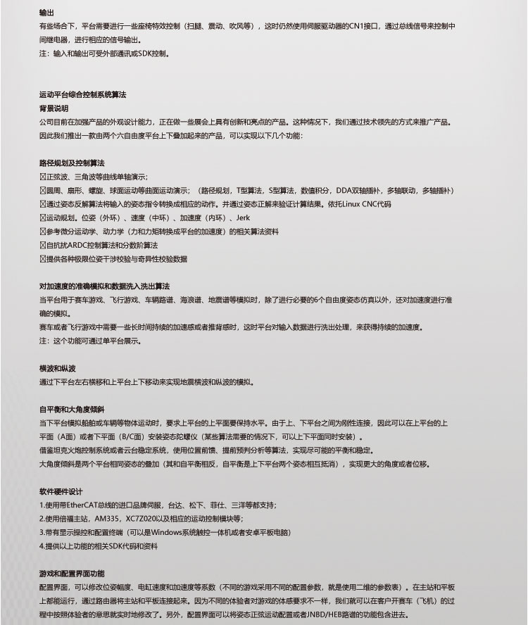 答: 我公司主要從事仿真平臺(tái)、六自由度平臺(tái)和運(yùn)動(dòng)平臺(tái)控制卡的研發(fā)、生產(chǎn)與銷售,同時(shí)承接大型4D/5D/7D影院等工程。專注技術(shù)領(lǐng)先,提升用戶體驗(yàn)是我們的追求!