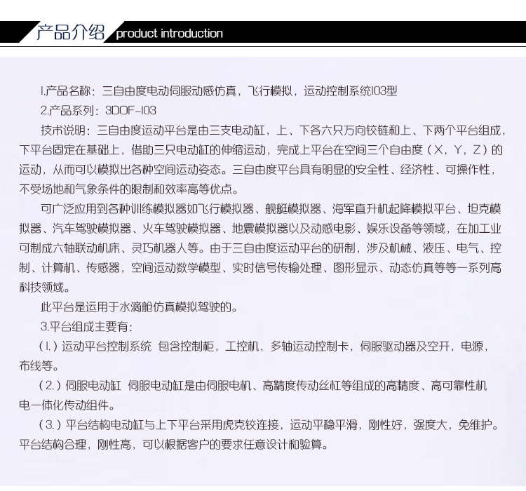 3.平臺(tái)是屬于三自由度電動(dòng)平臺(tái),它可以實(shí)現(xiàn)空間的三個(gè)運(yùn)動(dòng)姿態(tài),即前后俯仰,左右滾轉(zhuǎn),上下升降。駕駛一次我們這種平臺(tái)模擬機(jī)不亞于進(jìn)行了一次真實(shí)的空戰(zhàn)。