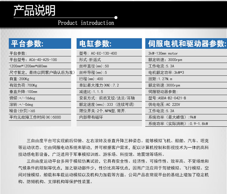 本公司的動(dòng)感座椅平臺(tái)的有效載荷(載人數(shù)量)、升降行程、傾斜角度、方位角度、縱/橫向位移等關(guān)鍵參數(shù)可根據(jù)用戶的需求定制。