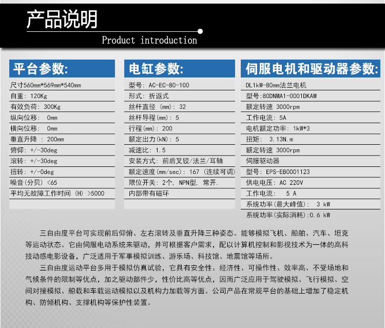 三自由度運動平臺多用于模擬仿真試驗,它具有安全性、經(jīng)濟性、可操作性、效率高、不受場地和氣候條件的限制等優(yōu)點,加之驅(qū)動部件少,性價比高等優(yōu)點,因而廣泛應(yīng)用于駕駛模擬、飛行模擬、空間對接模擬、船載和車載運動模擬以及機構(gòu)力加載等方面。公司產(chǎn)品在常規(guī)平臺的基礎(chǔ)上增加了穩(wěn)定機構(gòu)、防傾機構(gòu)、支撐機構(gòu)等保護(hù)性裝置。
