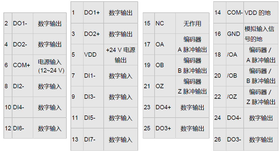 2. 關(guān)于負(fù)極回路部分:14腳(COM-)和16腳(GND)需要短接起來。如果使用抱閘時,應(yīng)將2腳(DO1-)也一同短接起來。